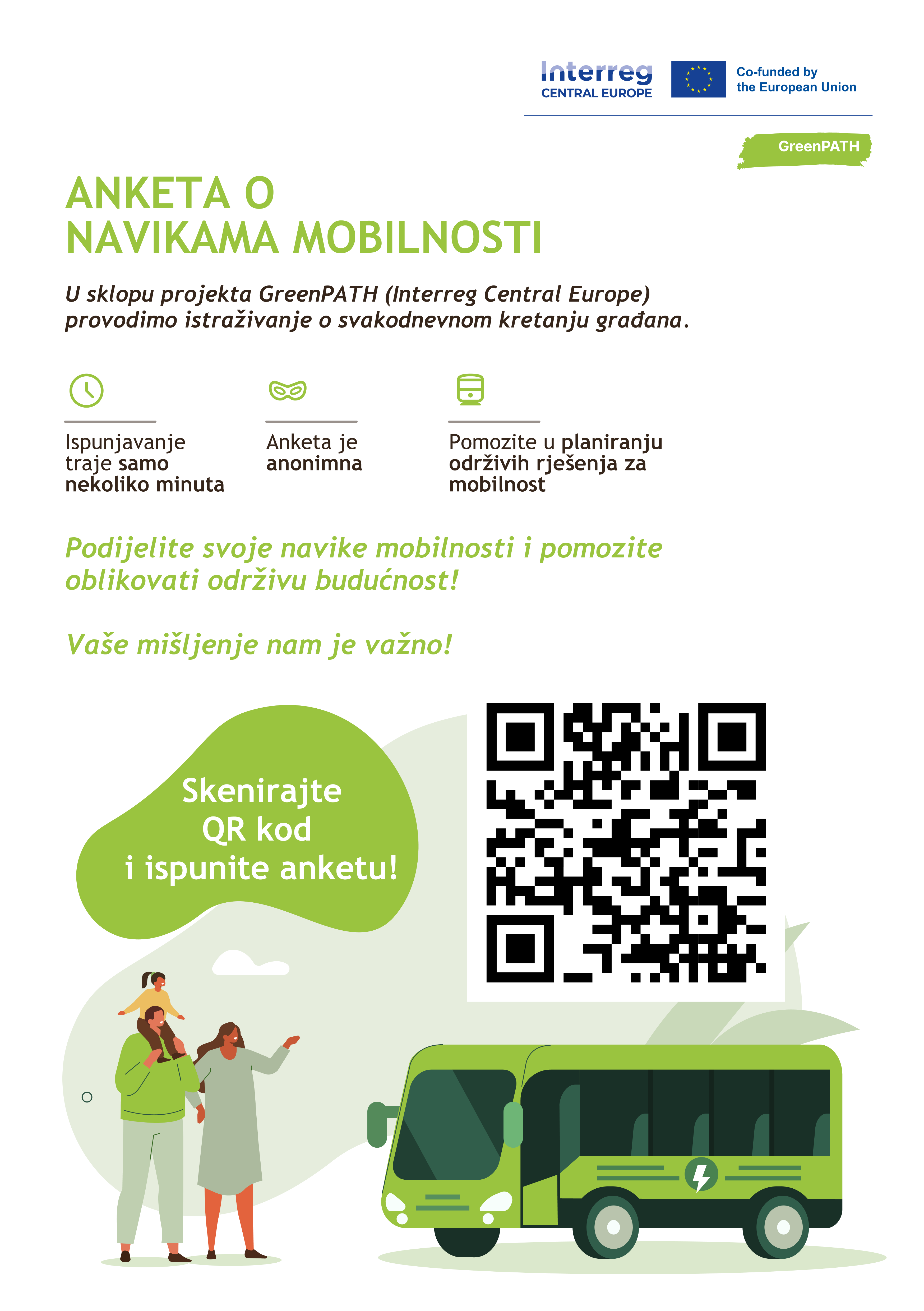 Grad Osijek u okviru projekta GREENPATH provodi anketiranje za izradu prometnog modela za tri gospodarske zone (PZ Nemetin, PZ IT park i PZ S cesta)ovim putem pozivamo vas da popunite anketu na slijedećem linku ili skenirate QR code iz priloženog letka.